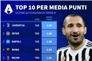 体育资讯4月9日讯 德国转会市场统计了过去20个赛季意甲球队的联赛场均积分,以及总积分,并列出榜单。