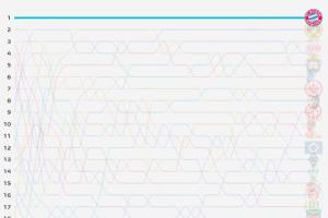 数据机构Football Meets Data晒出了本赛季德甲排名的走势图,拜仁从首轮6-0莱比锡开始,一直稳坐榜首。相比之下其余17支的球队的排名则不断上下变动。