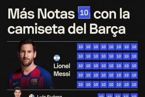 巴萨生涯获评10分场次排名: