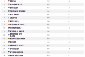 体育资讯4月13日讯 著名数据机构OPTA对全球超过10000家俱乐部打造了一个评分系统,评分范围从0到100。其中,0分代表全球最弱的球队,而100分则代表全球最强的球队。在OPTA全球俱乐部实力榜中,拜仁、阿森纳、曼城、巴萨以及巴黎圣日耳曼位居前五。