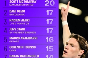 体育资讯4月14日讯 数据机构squawka统计了上赛季至今的五大联赛中前卫进球榜,麦克托米奈居首。