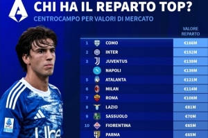 体育资讯4月16日讯 德转按后卫+门将、中场、前锋统计意甲各队球员身价,中场球员总身价中,科莫1.66亿欧居首,国米第二,尤文与那不勒斯并列第三。