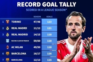 五大联赛单赛季进球榜:
