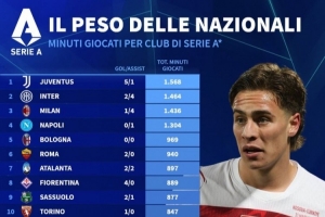 体育资讯4月2日讯 德国转会市场统计了意甲各队球员在这个国际比赛日的出场总时间,并列出榜单,尤文、国米、米兰前三。